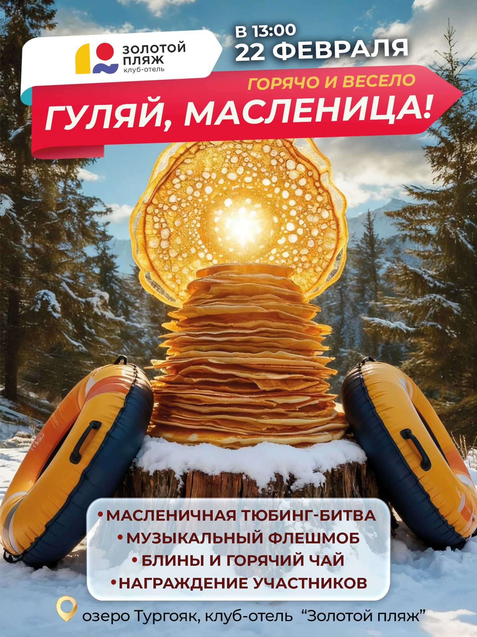 Подарите семье идеальный выходной на берегу Тургояка!🥞 Когда: 22 февраля, 13:00 🚀 Масленичная Тюбинг-битва🎶 Музыкальный флешмоб☕️ Блины и горячий чай🏆 Награждение участников Вход свободный!